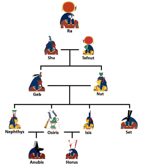The main “gods” of Egypt are below where you can see the “family” tree starting with Atum-Ra. He is called the first king of Egypt; thus, it was believed that the Pharaohs were his descendants and successors. His worship increased massively in the Fifth Dynasty, when Ra became a state-deity and pharaohs had specially aligned pyramids, obelisks, and sun temples built in his honour.